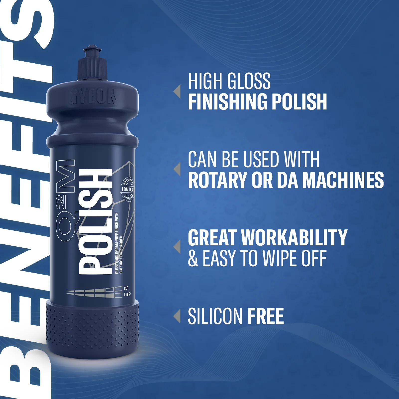 Q2M Polish is a high quality and fine finishing polish to bring out the most gloss and clarity of your paint system. With a medium level of cut and high level of finish it is also a great one step polish using low oils, no fillers, and high quality diminishing abrasives.